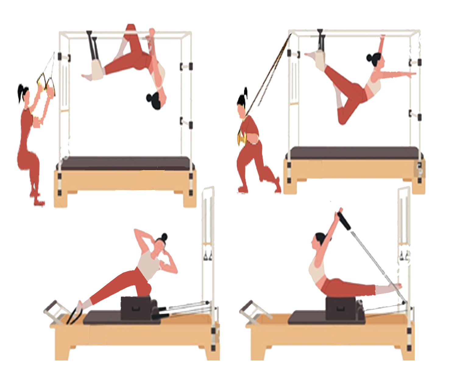 Le Reformer Cadillac est équipé de barres, de ressorts, de sangles, autres accessoires qui permettent une variété d'exercices